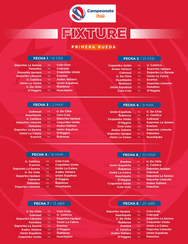 La jornada inicial incluirá el tradicional duelo de campeones, con Colo Colo visitando a Deportes La Serena en el Estadio La Portada. En paralelo, Universidad de Chile enfrentará a Ñublense, mientras que Universidad Católica se medirá ante Audax Italiano.