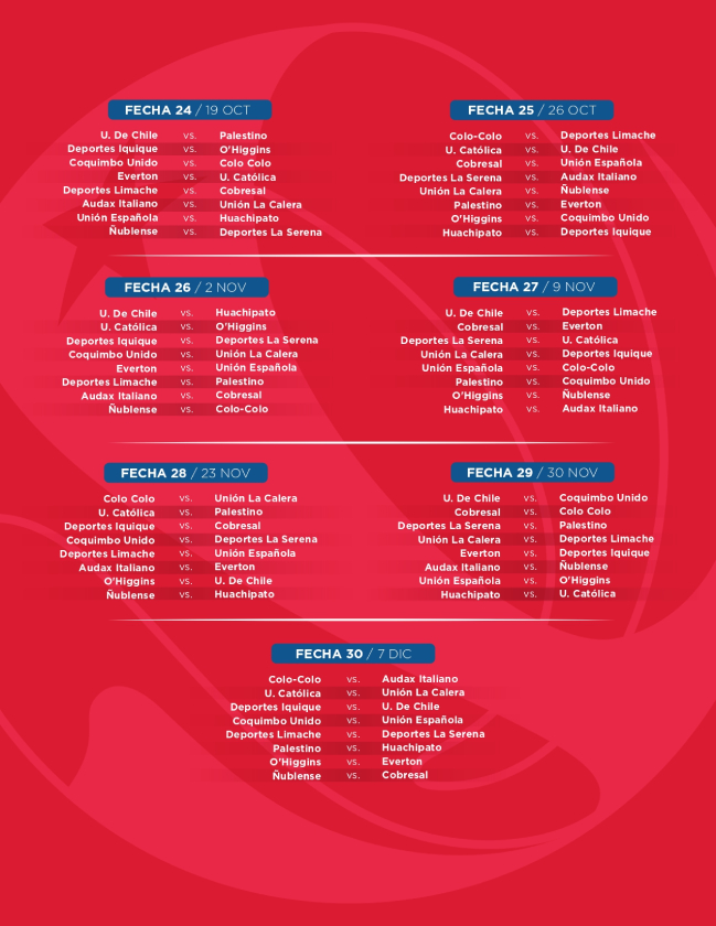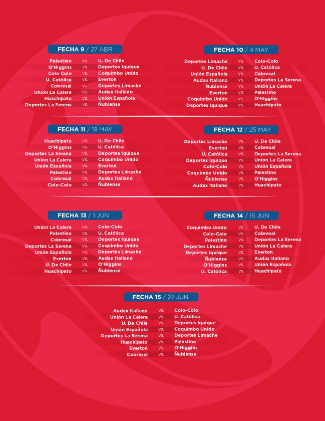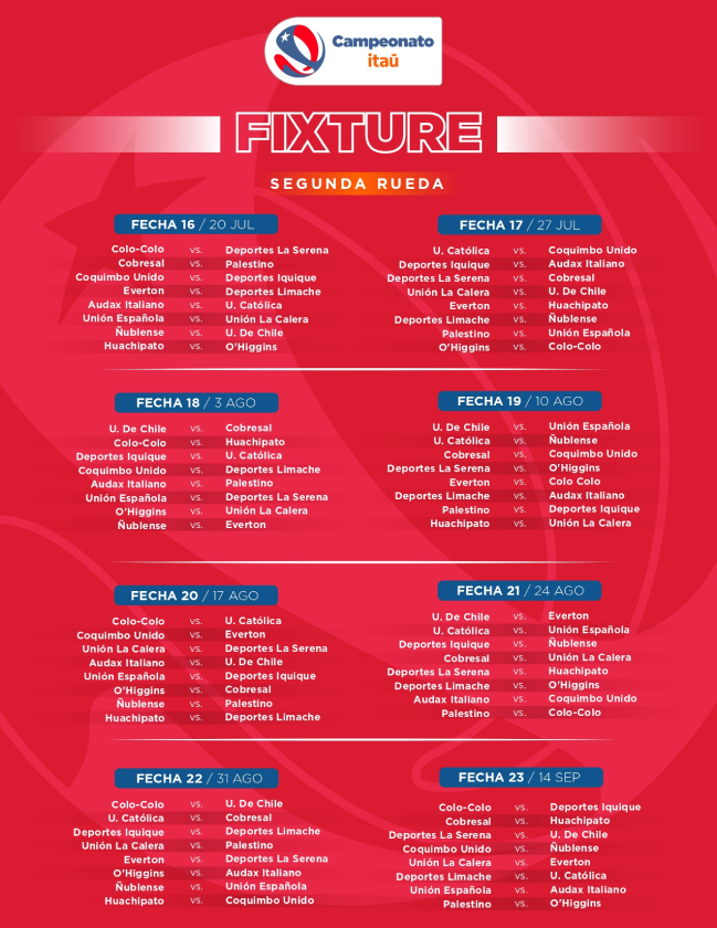 La ANFP confirmó que la segunda rueda del campeonato será espejada, lo que significa que se mantendrá el mismo orden de partidos, pero con localías invertidas. De esta manera, se garantizará una distribución equilibrada de encuentros para todos los equipos.