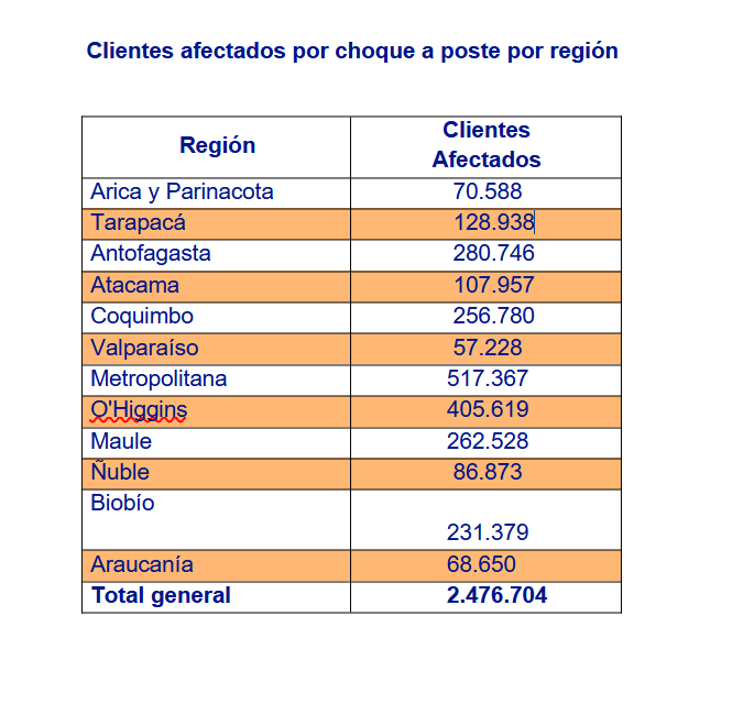 Le sigue la región de O´Higgins, con 407.308 clientes afectados; Antofagasta, con 280.746 clientes; Maule, con un total de 262.528 clientes sin energía producto de choques a poste; Coquimbo, con 256.780 clientes afectados y Biobío con 231.379 clientes con interrupciones de suministro por esta causa.
