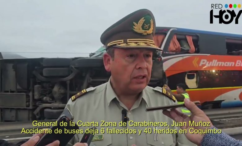 Al menos seis personas murieron en un accidente que involucró a cuatro autobuses en la bajada de Morillos, a la altura de Guanaqueros, en la Región de Coquimbo, durante la madrugada de este martes. El general de Carabineros Juan Muñoz confirmó en el lugar el fallecimiento de seis personas, entre ellas el conductor del cuarto autobús. Además, informó que 11 personas resultaron lesionadas y fueron trasladadas a distintos centros asistenciales de Coquimbo y La Serena, dos de ellas en riesgo vital. Asimismo, se reportó que aproximadamente 22 pasajeros no habrían sufrido lesiones y esperaban ser trasladados en autobuses de las mismas empresas involucradas en el accidente. Según el relato de un pasajero, el siniestro ocurrió luego de que un autobús de la empresa Pullman sufrió un desperfecto, lo que llevó a una segunda máquina a detenerse para prestar ayuda. Posteriormente, un tercer autobús chocó con el segundo y volcó, momento en que un cuarto vehículo impactó contra el tercero. Las otras cinco víctimas fatales serían pasajeros del tercer autobús. Carabineros informó que la Ruta 5 Norte permanece completamente cortada en dirección al norte a la altura de Guanaqueros.