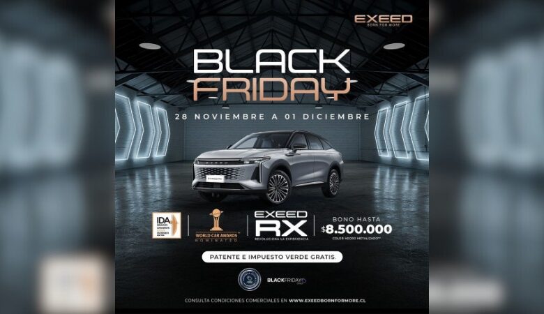 Santiago, noviembre 2025. EXEED, la marca de alta gama que ha revolucionado la industria con su enfoque tecnológico y su propuesta orientada a la experiencia del usuario, anuncia su campaña Black Friday 2025 con beneficios inéditos en su portafolio de SUVs. Durante este periodo desde el 25 noviembre hasta el 01 de diciembre, la marca ofrecerá bonos de hasta $8.500.000 junto con Patente e Impuesto Verde gratis en todos sus modelos, reforzando su compromiso por entregar mayor valor, equipamiento y accesibilidad a quienes buscan ingresar al segmento premium.